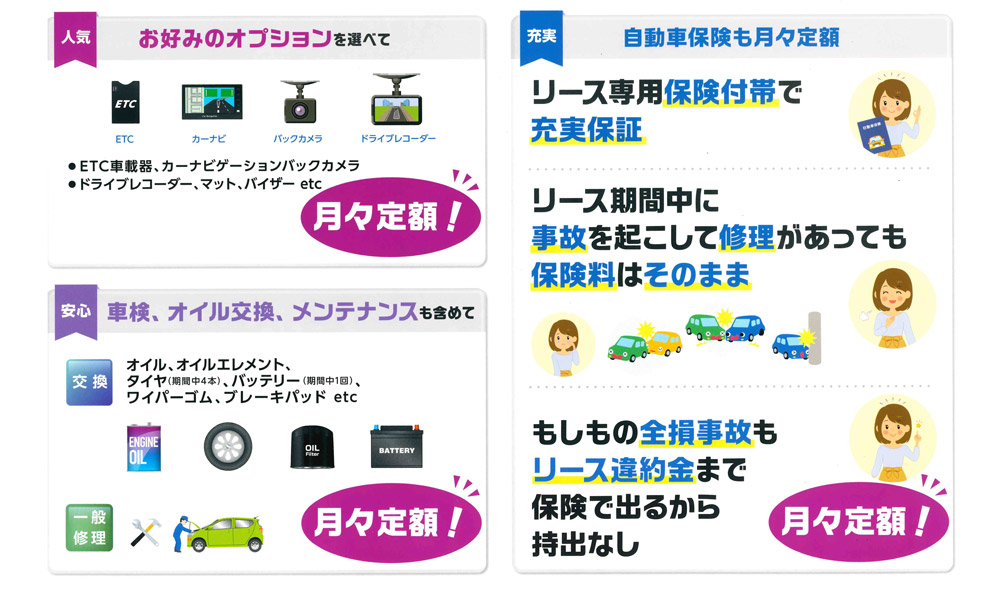 カーリースの場合、月々定額のリース料には期間中に発生する費用が含まれるため、